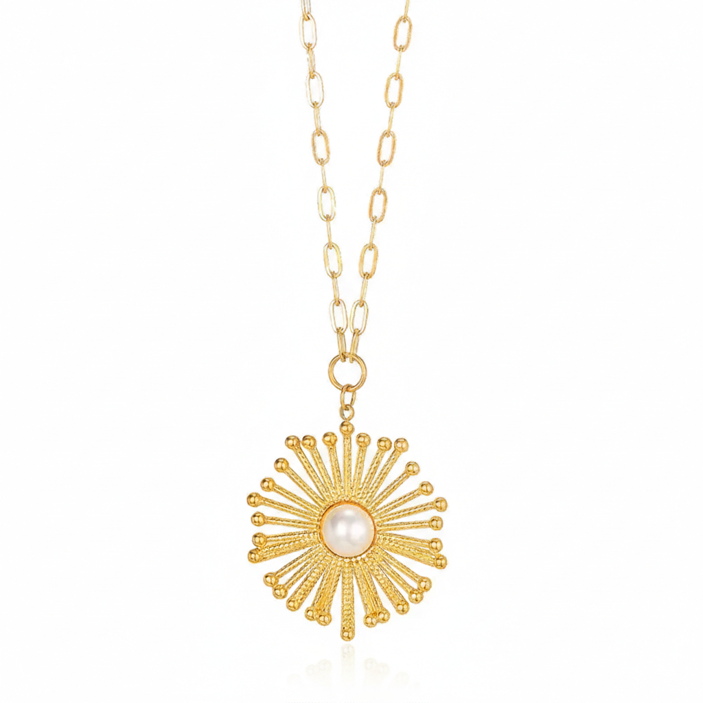 Channel the energy of the sun with this striking statement piece. A bold sunburst medallion, featuring intricate textured rays and a central pearl accent, hangs from a stylish paperclip chain. It’s a powerful, golden accessory that commands attention.